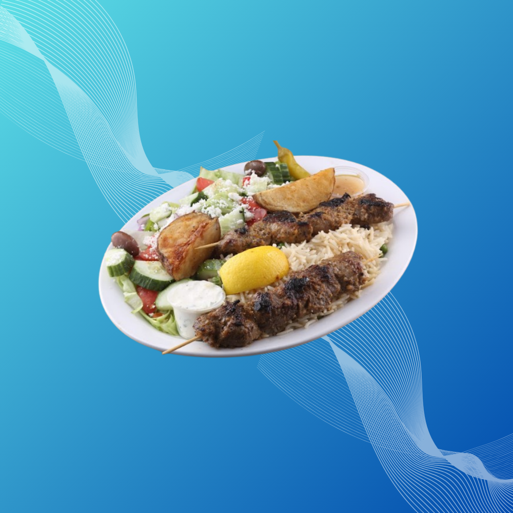 2 pieces skewer. Comes with rice pilaf, Greek potatoes, tzatziki sauce, lemon and Greek, caesar or horiatiki salad